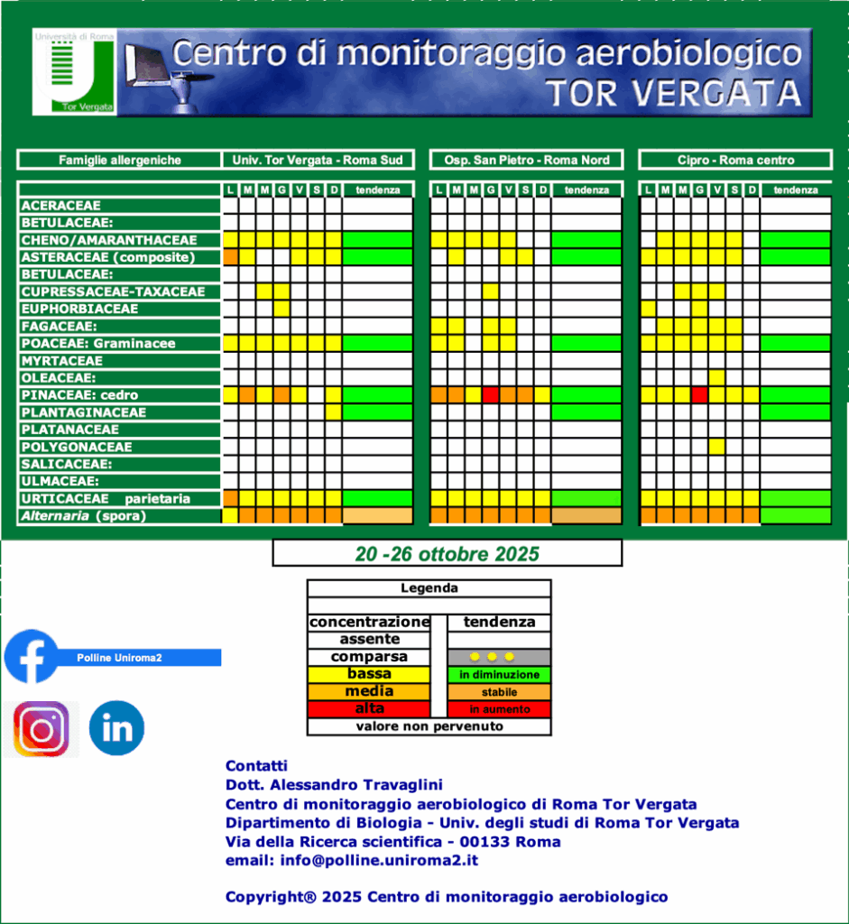 Vento forte e precipitazioni abbondanti hanno determinato un marcato calo delle concentrazioni polliniche nella città. Le uniche eccezioni sono rappresentate o da fattori stazionali (la concentrazione di lunedì di cedro all’ospedale San Pietro) o, nel caso di alternaria, da giorni senza fenomeni meteorologici di rilievo.