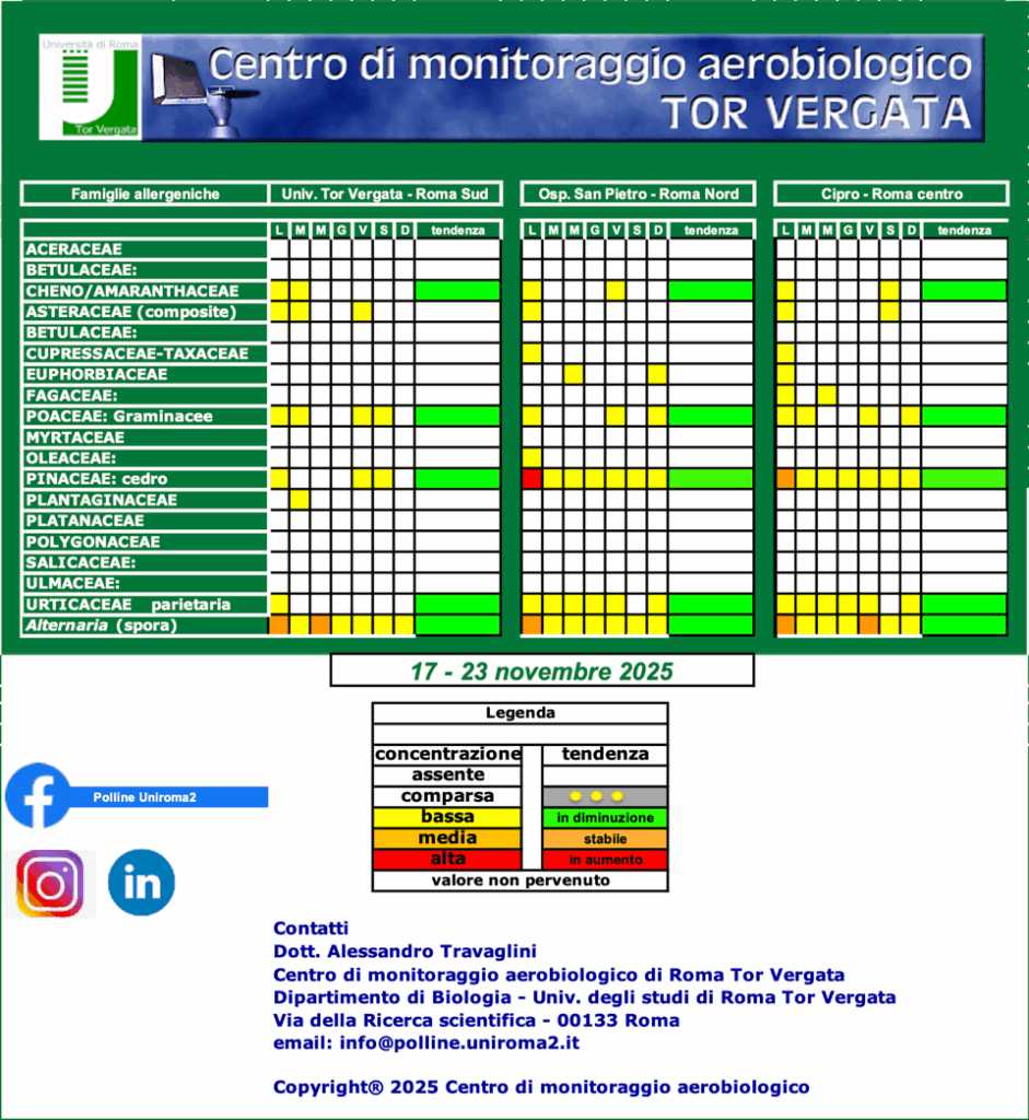 Vento forte e precipitazioni abbondanti hanno determinato un marcato calo delle concentrazioni polliniche nella città. Le uniche eccezioni sono rappresentate o da fattori stazionali (la concentrazione di lunedì di cedro all’ospedale San Pietro) o, nel caso di alternaria, da giorni senza fenomeni meteorologici di rilievo.