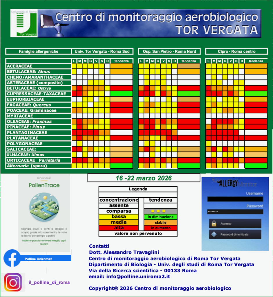 Il primo bollettino di primavera mostra il cambio di stagione con l’ingresso di pollini tipicamente primaverili e il calo più o meno accentuato di quelli invernali. L’ontano è ormai giunto a fine fioritura e anche il cipresso ha iniziato la sua fase calante, anche se sarà lenta e lunga. Nel frattempo hanno registrato concentrazioni alte o medio-alte il platano, il pino e il carpino nero e la parietaria, ovviamente in base alla vegetazione presente nelle tre zone di rilevamento.