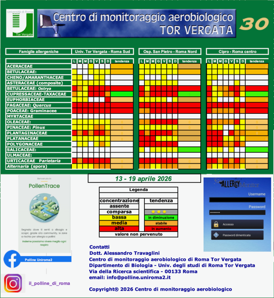 Lo spettro pollinico si presenta particolarmente variegato. Le concentrazioni di Quercus e Graminaceae risultano elevate in tutte le stazioni. Le Urticacee registrano valori alti a San Pietro e medio-alti a Tor Vergata e Cipro. Le concentrazioni di Cupressaceae, Plantaginaceae, Platanaceae, Ostrya e Polygonaceae mostrano un andamento variabile tra le stazioni; fanno eccezione le Polygonaceae, che presentano valori elevati a San Pietro. Si segnala la comparsa dei primi granuli di olivo. Le Oleaceae (generi diversi da olivo e frassino) si attestano su livelli medio-alti a San Pietro e Cipro mentre bassi a Tor vergata. I livelli di alternaria risultano complessivamente medio-bassi. Oltre alla sabbia che abbiamo visto su tutte le auto e altre superfici in aria sono in volo i semi di pioppo e salice, non sono polline e non solo allergenici! Nel bollettino è indicata nella colonna a destra della tabella dei valori di concentrazione delle diverse stazioni la tendenza secondo una scala cromatica: al posto di freccette o faccine, abbiamo scelto di indicare in rosso la tendenza in crescita e in verde quella in discesa La tendenza che indichiamo è ricavata dall’andamento storico delle concentrazioni per i diversi tipi pollinici, al netto delle condizioni meteorologiche, per tale ragione, può verificarsi che si verifichi un rialzo della concentrazione, anche iimportante, nonostante il trend sia discendente.